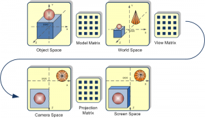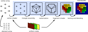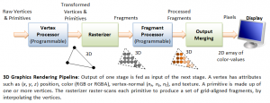 El programa vertex ha de pasar al programa fragment la posición ya transformada de los vértices, para que durante la rasterización se calcule la posición de cada posible pixel a pintar, cada fragmento. El programa fragment tiene una tarea muy concreta, indicar el color de cada pixel que se va a pintar. En la imagen superior se aprecia el proceso por el que pasan las coordenadas al aplicar la matriz MVP, mientras que en la imagen inferior y de forma muy resumida, se muestra el pipeline de renderizado.